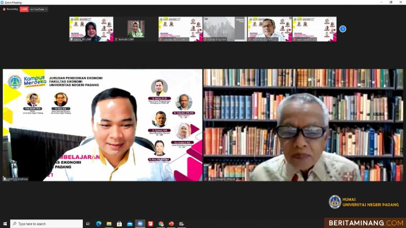 PADANG- Pusat Pengembangan Pembelajaran (Pusbangbel)Lembaga Pengembangan Pembelajaran dan Penjaminan Mutu (LP3M) Universitas Negeri Padang (UNP) bersama Program Studi (Prodi) Pendidikan Ekonomi merancang perangkat pembelajaran yang sesuai dengan tuntutan Indikator Kinerja Utama (IKU) 7 yaitu Pembelajaran Kolaboratif dan Partisipatif yang dicirikan dengan metode Case Method dan Team Based Project. Kegiatan ini digagas oleh Prodi Pendidikan Ekonomi Fakultas Ekonomi (FE) UNP dilaksanakan pada tanggal 9 Agustus 2021 secara daring.