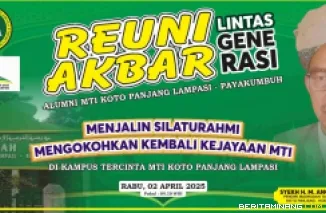 PAYAKUMBUH – Alumni Sekolah Madrasah Tarbiyah Islamiyah (MTI) Koto Panjang, Lampasi Tiga Nagori Kota Payakumbuh,gelar kegiatan Reuni Akbar lintas generasi dengan tema “Menjalin Silaturrahmi, Mengokohkan Kembali Kejayaan MTI”