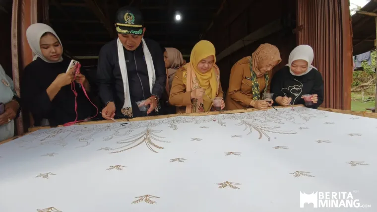 LIMA PULUH KOTA - Dinas Perindustrian dan Tenaga Kerja Lima Puluh Kota melakukan peninjauan pengolahan limbah gambir yang disulap menjadi bahan dalam pewarna kain batik dengan berbagai corak yang dikerjakan oleh kelompok batik Nagari Talang Maua, Kecamatan Mungka, Senin (5/5/2025).