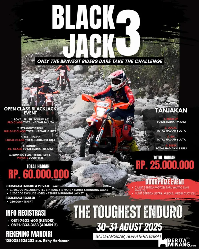 TANAH DATAR - Setelah sukses pada gelaran pertama dan kedua,Para pencinta Adventure di Sumatera Barat Khususnya di Kabupaten Tanah Datar dengan menggunakan motor trail boleh bergembira kembali,Pasalnya, Event Trabas BLACK JACK 3 ONLY THE BRAVEST RIDERS DARE TAKE THE CHALENGE kembali digelar.Event Trabas ini di rencanakan akan digelar pada Sabtu dan Minggu 30 – 31 Agustus 2025 di Tabek Patah Kabupaten Tanah Datar.