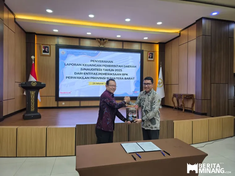 PAYAKUMBUH — Wali Kota Payakumbuh, Zulmaeta menyerahkan Laporan Keuangan Pemerintah Daerah (LKPD) unaudited Tahun Anggaran 2025 kepada Badan Pemeriksa Keuangan (BPK) Perwakilan Provinsi Sumatera Barat di Padang, Kamis (26/03/2026).