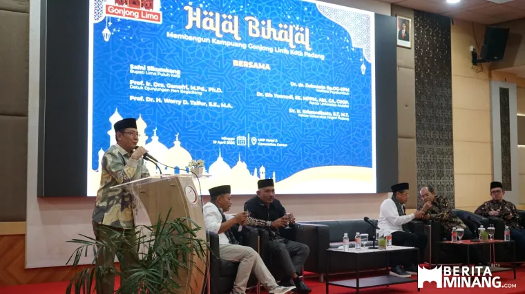 PADANG - Wali Kota Payakumbuh, Zulmaeta, dan Wakil Wali Kota, Elzadaswarman, menjadi sorotan dalam Diskusi Mambangun Kampuang Luhak Limo Puluah yang digelar dalam rangka Halal Bihalal organisasi Gonjong Limo Kota Padang di Ruang Convention Lantai 4 UNP Hotel, Kota Padang, Minggu (19/4/2025). Diskusi ini menjadi panggung bertemunya para pemikir, akademisi, dan tokoh pemerintahan yang berasal dari Luhak Limo Puluah.