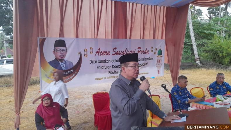 SINTOGA - Pemerintah Daerah Provisi Sumbar terus melakukan berbagai terobosan bagi warganya guna memberikan kemudahan dalam membayar pajak daerah. Sehingga, warga diharapkan bisa patuh dalam membayar pajak. Penegasan itu disampaikan Anggota DPRD Sumbar Jasma Juni (JJ) Dt Gadang, saat memberikan sambutan dalam kegiataan Sosialisasi Perda No. 04 Tahun 2018 Tentang Pajak Daerah di Kecamatan Sintuak Tobo Gadang (Sintoga) Kabupaten Padang Pariaman, Sumbar yang dipusatkan di Nagari Tobo Gadang, Senin (17/7/2023).