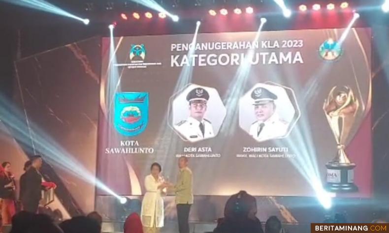 NAMA KOTA SAWAHLUNTO terbaca jelas dilayar panggung Anugerah Kota Layak Anak (KLA) 2023 di Hotel Padma, Kota Semarang, Sabtu malam (22/7/2023). Begitu pula foto wajah Walikota H.Deri Asta dan Wakil Walikota H.Zohirin Sayuti yang disaksikan Menteri PPA I Gusti Ayu Bintang Puspayoga yang akan menyerahkan sesuatu dibalik tanda gambar itu. Sejenak, bunyi tepuk tangan bergemuruh ketika Kota Sawahlunto disebut meraih KLA Predikat Utama 2023.