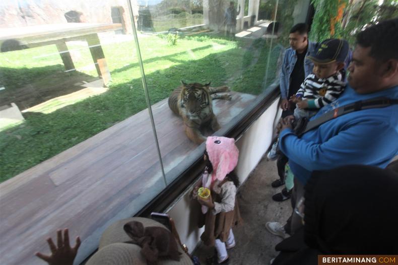Pengunjung melihat harimau sumatera (Panthera tigris sumatrae) di Taman Marga Satwa Dan Budaya Kinantan Bukittinggi, Sumbar, Sabtu (29/7/2023). Hari ini tanggal 29 Juli diperingati sebagai Global Tiger Day atau Hari Harimau Sedunia. (Beritaminang/Adi Prima)