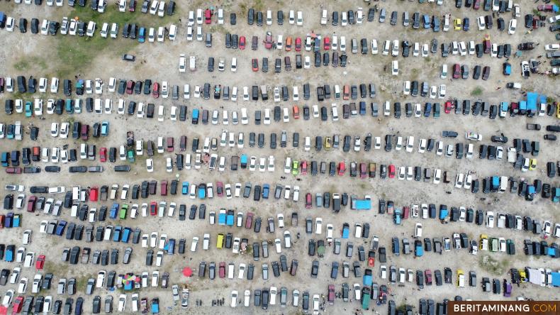 Foto udara ratusan kendaraan penonotn memadati Kejurnas Pacu Kuda Seri 1 di Gelanggang Pacuan Kuda Kandi, Sawahlunto, Sumatera Barat, Minggu (30/7/2023). Babak final pacu kuda ini di ikuti oleh kuda-kuda dari 9 provinsi, Jawa Tengah, Jawa Timur, Jawa Barat, Sulawesi Utara, DKI Jakarta, Kalimantan Selatan, Aceh, Riau, dan tuan rumah Sumatera Barat. (Beritaminang/Adi Prima)