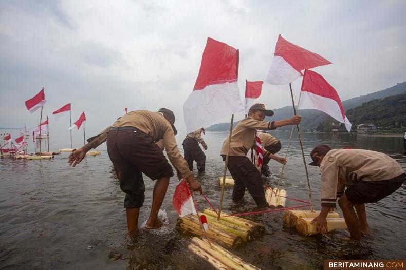 Murid sekolah dasar ikuti upacara peringatan HUT ke-78 RI di Danau Singkarak, Solok, Sumatera Barat, Kamis (17/8/2023). Pemerintah Kabupaten Solok menggelar upacara pengibaran bendera merah putih di atas lapangan terapung di kawasan Danau Singkarak untuk memperingati HUT ke-78 RI.(Beritaminang/Adi Prima)
