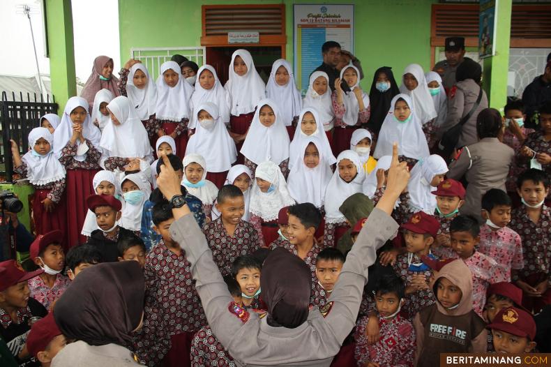 Relawan gabungan berikan dukungan trauma healing kepada murid-murid sekolah dasar di Nagari Bukik Batabuah, Agam, Sumatera Barat, Indonesia, Rabu (17/1/2024). Selain dukungan trauma healing tim relawan gabungan juga memberikan layanan pemeriksaan kesehatan bagi warga dan anak-anak yang terdampak erupsi Gunung Marapi. (Beritaminang/AP)
