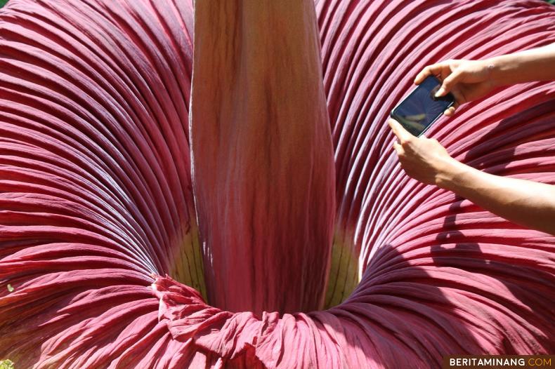 Pengunjung mendokumentasikan bunga bangkai raksasa (Amorphophallus titanum) yang mekar sempurna di kawasan hutan lindung Palupuh, Kabupaten Agam, Sumbar, Minggu (21/1/2024). Data BKSDA Sumbar tahun 2024 ini diprediksi ada 4 bunga Amorphophallus titanum yang akan mekar sempurna di hutan Palupuh. (Beritaminang/AP)