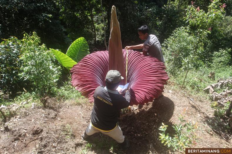 Petugas BKSDA Sumbar mengukur tinggi dan diameter bunga bangkai raksasa (Amorphophallus titanum) yang mekar sempurna di kawasan hutan lindung Palupuh, Kabupaten Agam, Sumbar, Minggu (21/1/2024). Data BKSDA Sumbar tahun 2024 ini diprediksi ada 4 bunga Amorphophallus titanum yang akan mekar sempurna di hutan lindung Palupuh. (Beritaminang/AP)