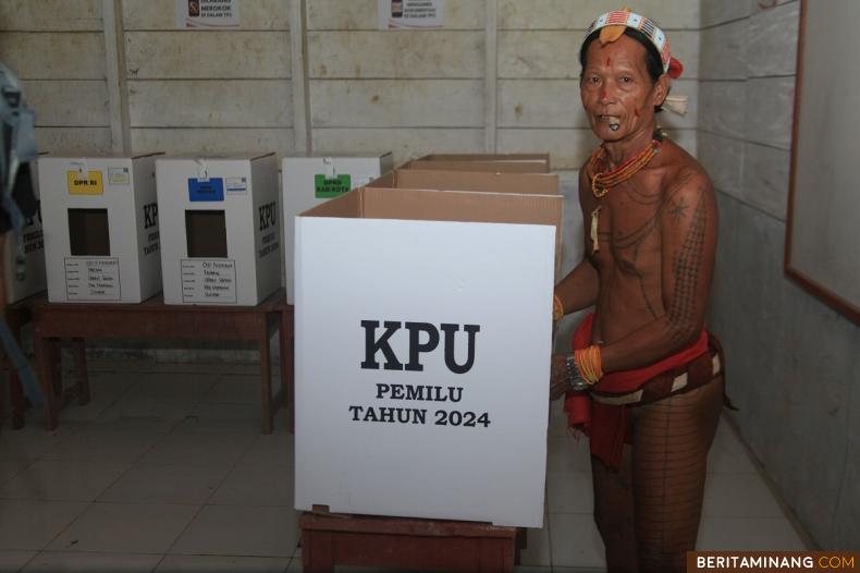 Sikerei (paramedis tradisional) menggunakan hak pilihnya di Desa Madobag, Kabupaten Kepulauan Mentawai, Sumatera Barat, Rabu (14/2/2024). Data KPU Kabupaten Kepulauan Mentawai sebanyak 66.129 DPT di 367 TPS (Tempat Pemungutan Suara) akan menggunakan hak suaranya untuk memilih presiden, anggota DPRD daerah, DPRD provinsi, DPR RI dan DPD RI. (Beritaminang/AP)