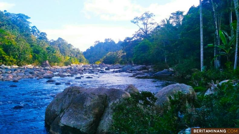 BATU SUNGAI BARUNG BELANTAI - Lukisan alam bebatuan di tengah sungai di Kawasan Nagari Barung-Barung Belantai Kecamatan Koto XI Tarusan begitu indah. Bila melintas, sempatkan berhenti sejenak menimatinya, menikmati gemerinciknya air dan hembusan angin gunung. Foto Vajrel Tri Ananda