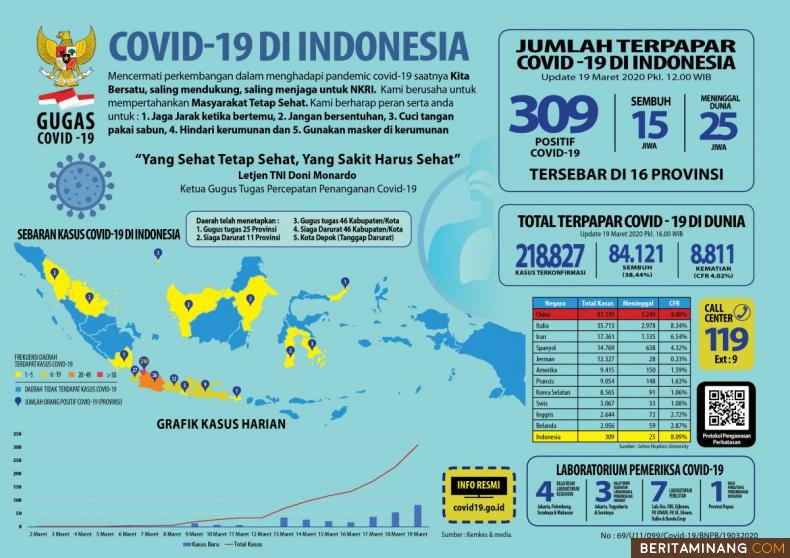 TERUS BERTAMBAH - Penyebaran manusia terinfeksi Virus Corona (Covid-19) di Indonesia terus bertambah. Per 19 Maret 2020, sudah 309 orang positif Corona di Indonesia tersebar di 16 provinsi, 15 orang sudah sembuh dan 25 orang meninggal dunia. Untuk keseluruhan negara di dunia, 218.827 terkonfirmasi kasus, 84.121 sembuh( 34.44 %) dan 8.811 meninggal (4,02%). Foto infografik situs resmi covid19.go.id