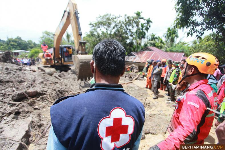 Relawan PMI dan petugas gabungan mencari korban tertimbun material longsor di Malalo, Tanah Datar, Sumbar, Minggu (05/4/2020).Data Pemkab Tanah Datar menyatakan sebanyak empat rumah rusak dan dua orang warga tewas tertimbun material longsor karena banjir bandang di daerah tersebut. (Beritaminang/Adi Prima).