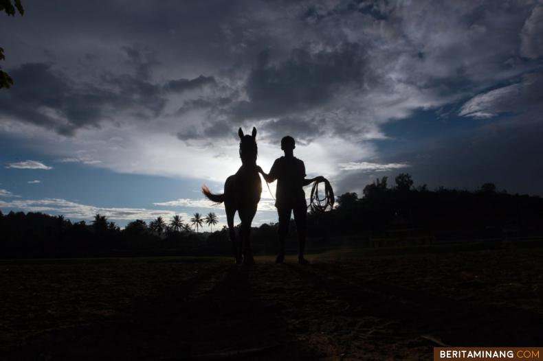 MELATIH KUDA PACU - Siluet pemilik melatih kuda pacu di GOR Dang Tuanku Bukik Gombak, Batusangkar, Sumatera Barat, Selasa (07/04/2020). Pemilk tetap rutin melatih kuda pacu meskipun Ivent pacu kuda tahun 2020 ditunda sementara waktu karena pandemic virus Covid-19. Foto Adi Prima