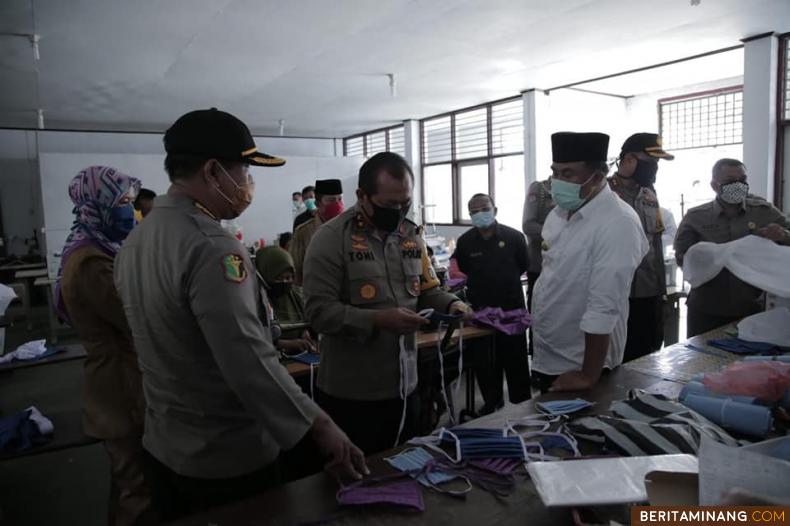 BUAT APD DAN MASKET SENDIRI- Usai memantau bersama Pos Penanganan Covid-19 di wilayah perbatasan Sumbar-Jambi di Sungai Rumbai, Bupati Dharmasraya, Sutan Riska Tuanku Kerajaan mengajak Kapolda Sumbar, Irjen Pol Toni Harmanto, untuk melihat proses produksi masker dan APD (Alat Pelindung Diri), di BLK Pulau Punjung Dinas Transnaker Kabupaten Dharmasraya, Selasa (7/4/2020). Selama penanganan Covid-19 ini, Pemkab Dharmasraya memang berinisiatif untuk memproduksi masker dan APD secara mandiri. Foto Humas Dharmasraya