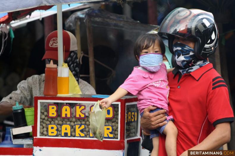 GELIAT JUALAN TAKJIL - Warga berbelanja pabukoan (takjil) di Pasa Pabukoan pasar Atas depan Masjid Ihsan, Batusangkar, Jumat (24/04/2020). Pasa pabukoan Batusangkar tetap buka namun dengan menerapkan protokol kesehatan, pedagang sepakat mengatur jarak berjualan 1 hingga 2 meter, memakai masker dan sarung tangan serta juga disediakan tempat cuci tangan. Pengunjung dan penjual harus pakai masker. Foto Adi Prima