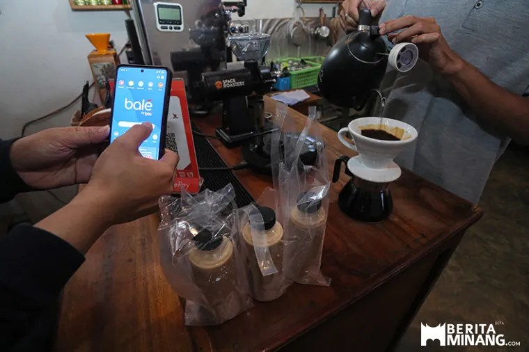 Warga melakukan pembayaran menggunakan aplikasi bale by BTN di gerai kopi di Batusangkar, Sumbar, Jumat (20/2/2026). Bale BTN adalahsuper applikasidari Bank BTN yang menawarkan fitur gaya hidup dalam satu aplikasi terintegrasi serta kemudahan transaksi perbankan seperti pembukaan rekeningonline, pembayaran tagihan, transfer yang bebas biaya transaksi. (Adi Prima/Beritaminang)
