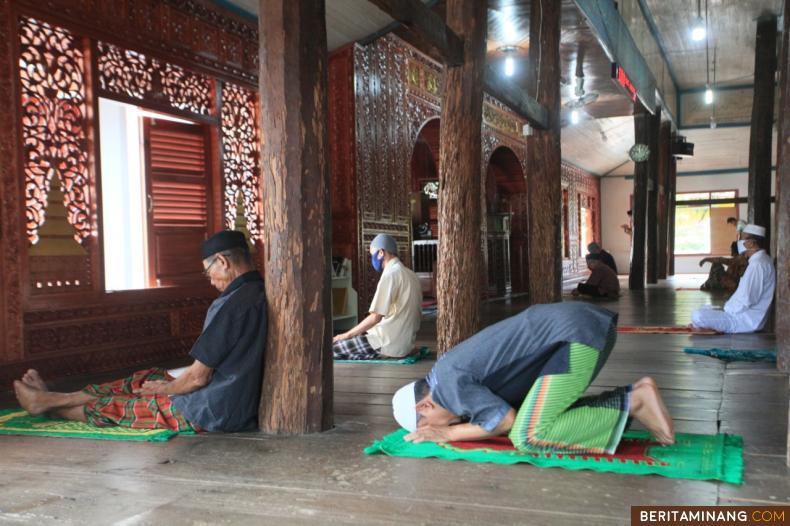 JUMATAN PERDANA - Warga melaksanakan sholat Jumat perdana dalam pandemi Covid-19 di Masjid Raya Limo Kaum, Tanah Datar, Sumbar, Jumat (08/05/2020). Majelis Ulama Indonesia (MUI) Tanah Datar mengeluarkan maklumat boleh sholat Jumat di masjid dengan tetap memperhatikan protokol kesehatan Covid-19, di antaranya menggunakan masker dan membawa sajadah sendiri. Foto Adi Prima