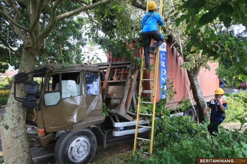 LAKA TRUK BANSOS - Petugas membersihkan material yang tersangkut di mobil truk pembawa beras bantuan sosial untuk warga terdampak Covid-19 di Pincuran Tujuah, Batusangkar, Sumatera Barat, Kamis (21/05/2020). Truk yang membawa beras 20 ton itu menabrak pohon karena mengalami rem blong, tidak ada korban jiwa dalam kecelakaan tunggal ini. Foto Adi Prima