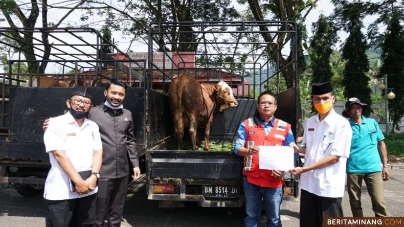Pihak PT. Supreme Energi, Bujang Joan Dt Panyalai menyerahkan bantuan sapi kurban pada Pemkab. Solsel diterima Sekdakab Solsel. H. Yulian Efi disaksikan Ketua DPRD Solsel Zigo Rolanda dan Kabag Kesra, Zuardi.