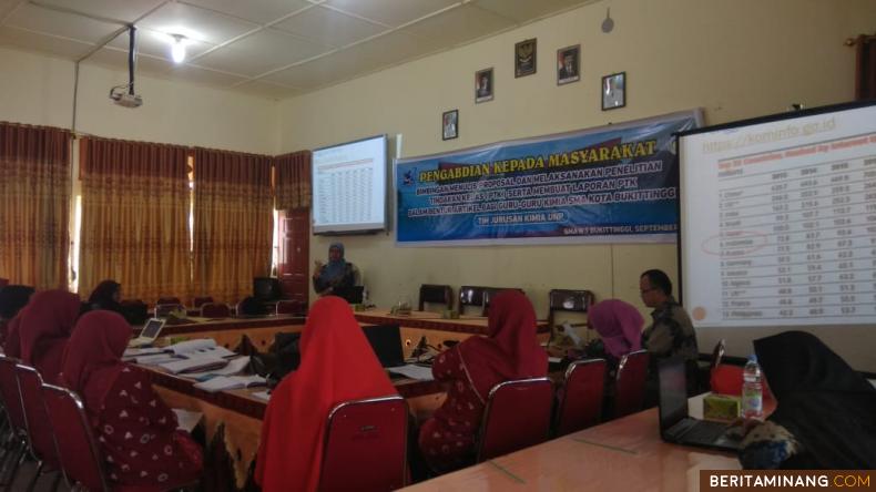 Untuk menyikapi persoalan guru-guru SMA Kota Bukittinggi menulis artikel dan untuk mengatasi adanya kendala yang dialami guru-guru dalam menulis artikel Penelitian Tindakan Kelas (PTK), FMIPA UNP memberikan pendampingan secara intensif kepada guru-guru Kimia yang tergabung dalam MGMP Kota Bukittinggi yang dilaksanakan di SMA Negeri 1 Bukittinggi, 21-22 September 2019.