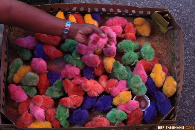 Penjual anak ayam warna-warni menggelar dagangannya di Pasar Batusangkar, Tanah Datar, Sumbar, Kamis (21/01/2021). Setiap Kamis merupakan hari balai (pasar) di Tanah Datar, pedagang berdatangan dan berjualan bermacam dagangan di Pasar Batusangkar. (Beritaminang/AP).
