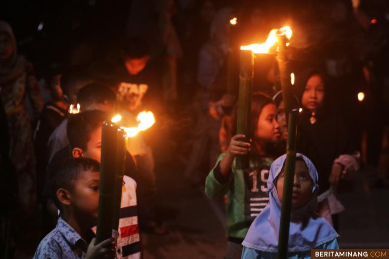 Warga menyambut Idul Fitri 1442 H dengan pawai obor di Lima Kaum, Batusangkar, Sumbar, Rabu malam(12/5/2021). Pemerintah Indonesia menetapkan 1 Syawal 1442 H jatuh pada hari Kamis (13/5).(Beritaminang/AP).